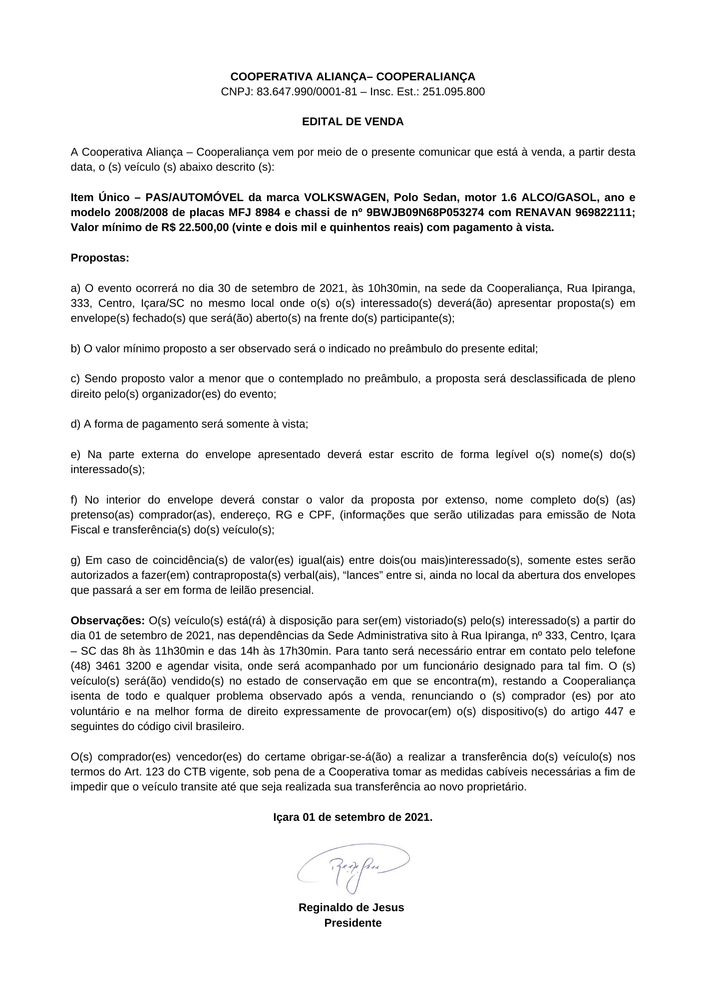A Cooperativa Aliança – Cooperaliança vem por meio de o presente comunicar que está à venda, a partir desta data, o (s) veículo (s) abaixo descrito (s):