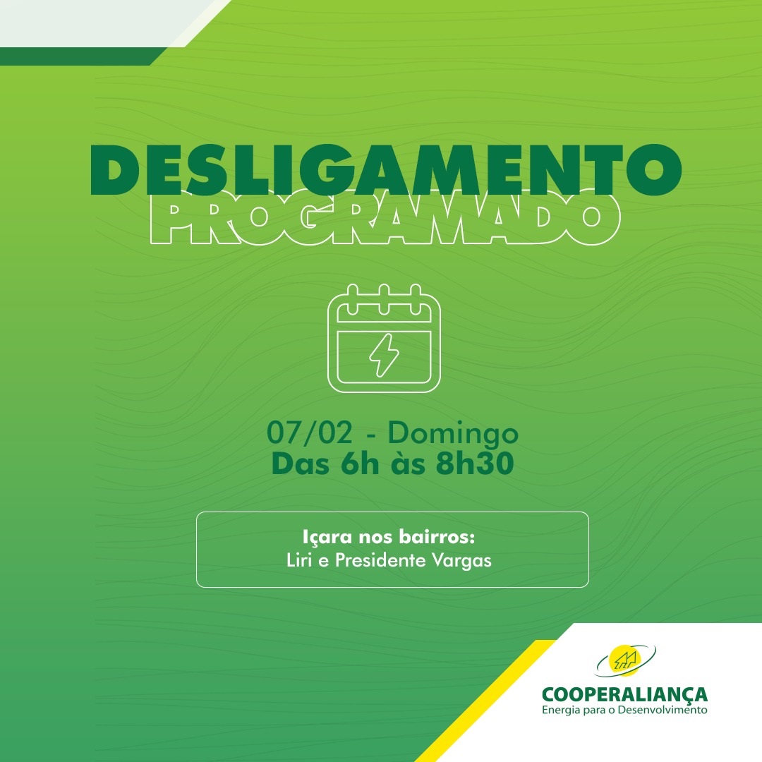 A Cooperativa Aliança comunica aos seus associados e consumidores que no dia 07 de fevereiro (domingo), haverá desligamento de energia elétrica nos bairros: Liri e Presidente Vargas. O desligamento será das 6h às 8h30, para manutensão preventiva no sistema de Média Tensão.
