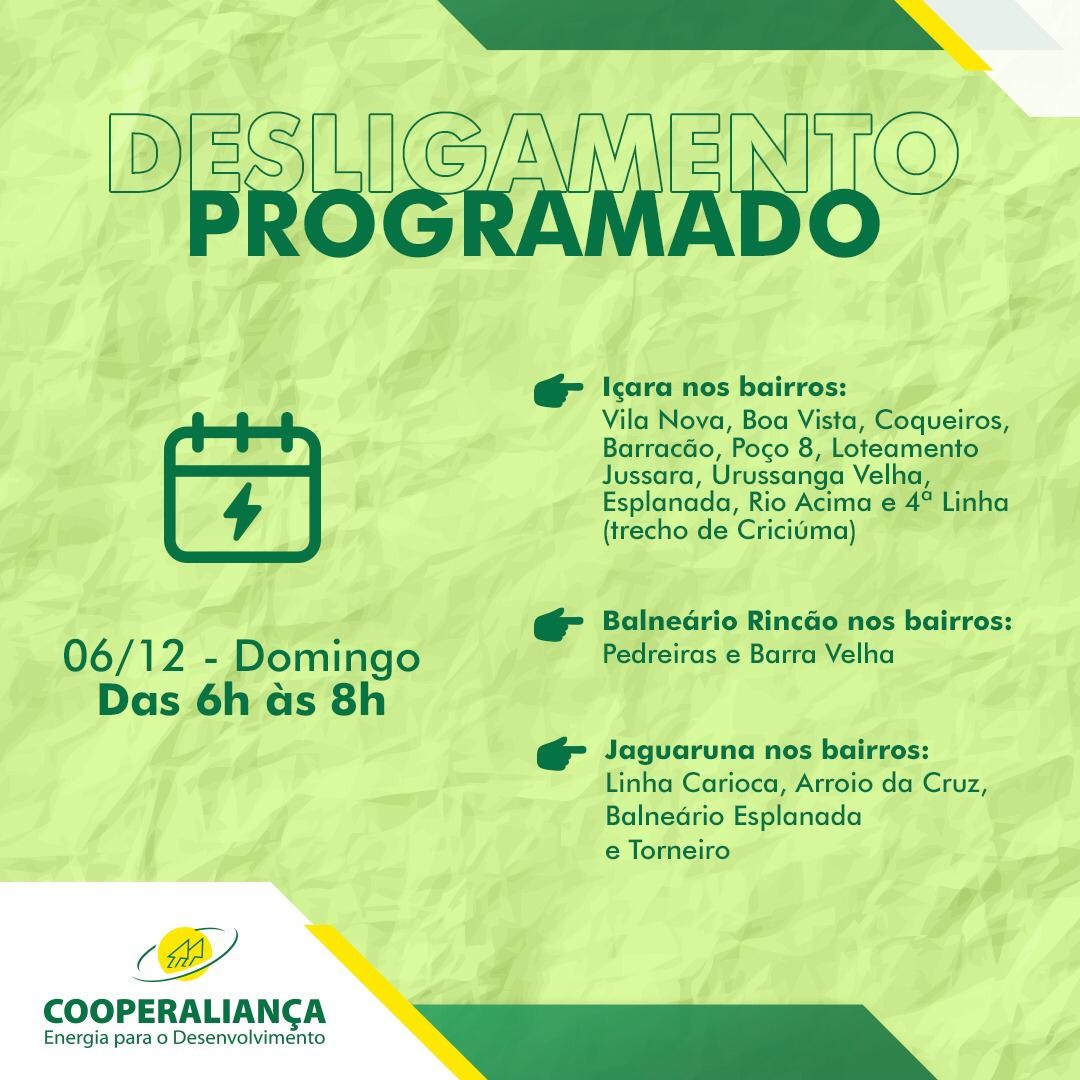 A Cooperativa Aliança comunica aos seus associados e consumidores que no dia 06 de dezembro (domingo), haverá desligamento de energia elétrica nas localidades: Vila Nova; Boa Vista; Coqueiros; Barracão; Poço 08; 4ª Linha; Loteamento Jussara; Urussanga Velha; Esplanada; Rio Acima; Linha Carioca; Arroio da Cruz; Balneário Esplanada; Torneiro; Pedreiras; Barra Velha e Balneário Rincão. O desligamento será das 6h às 8h, para energização de equipamentos na subestação Rincão para aumento da capacidade de carga melhoria no sistema