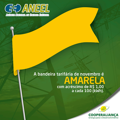 Após cinco meses com a tarifa de energia na chamada Bandeira Vermelha – com acréscimo de R$5 em cima da tarifa convencional, os consumidores passarão a pagar mais barato nesse mês de novembro a entrar na Bandeira Amarela. Dessa forma, haverá redução na cobrança, passando ao custo de apenas R$1 a cada 100 kWh, R$ 4 a menos que a atualmente em vigor, conforme definido pela Agência Nacional de Energia Elétrica (Aneel).