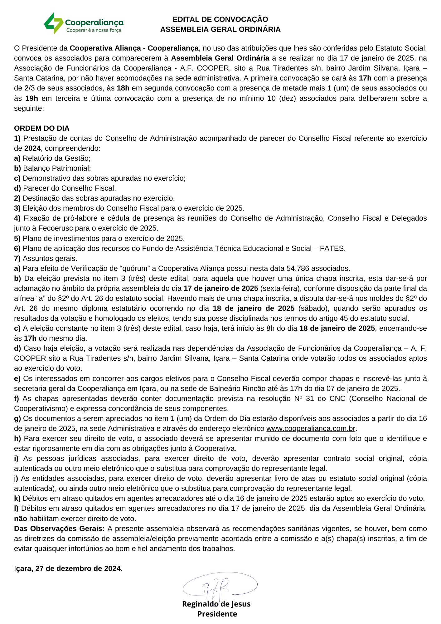 O Presidente da Cooperativa Aliança - Cooperaliança, no uso das atribuições que lhes são conferidas pelo Estatuto Social, convoca os associados para comparecerem à Assembleia Geral Ordinária a se realizar no dia 17 de janeiro de 2025, na Associação de Funcionários da Cooperaliança - A.F. COOPER, sito a Rua Tiradentes s/n, bairro Jardim Silvana, Içara – Santa Catarina, por não haver acomodações na sede administrativa. A primeira convocação se dará às 17h com a presença de 2/3 de seus associados, às 18h em segunda convocação com a presença de metade mais 1 (um) de seus associados ou às 19h em terceira e última convocação com a presença de no mínimo 10 (dez) associados para deliberarem sobre a seguinte: