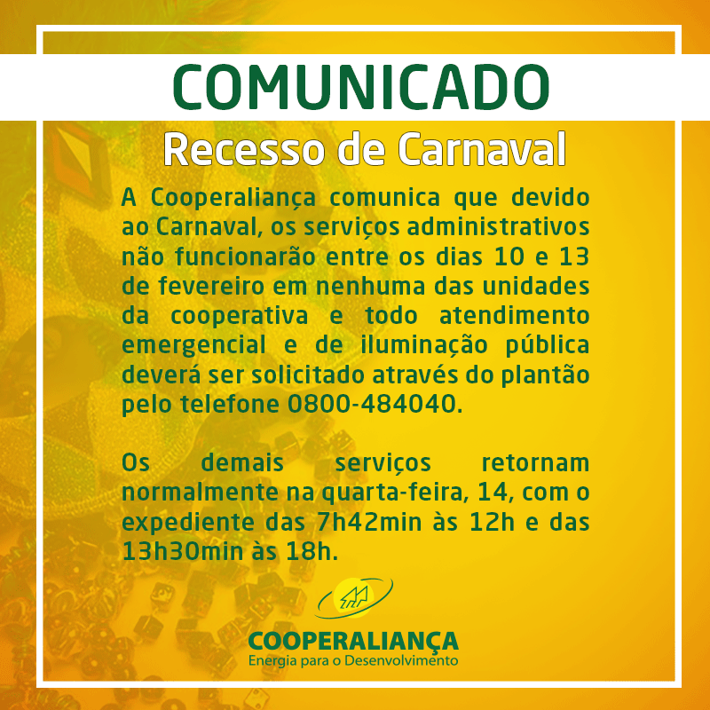 A Cooperaliança comunica que devido ao Carnaval, os serviços administrativos não funcionarão entre os dias 10 e 13 de fevereiro em nenhuma das unidades da cooperativa e todo atendimento emergencial e de iluminação pública deverá ser solicitado através do plantão pelo telefone 0800-484040. Os demais serviços retornam normalmente na quarta-feira, 14, com o expediente das 7h42min às 12h e das 13h30min às 18h.
