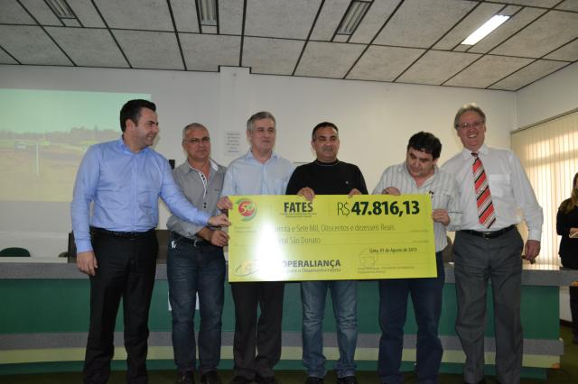 A Cooperaliança realizou, na tarde desta quinta-feira, dia 1 de agosto, a entrega de um cheque ao Hospital São Donato. O recurso provém do Fundo de Assistência Técnica Educacional e Social, o Fates, e a doação foi definida, e aprovada com méritos, pelos associados da Cooperativa durante a Assembleia Geral Ordinária, realizada em março deste ano. Durante o evento, o presidente em exercício da Cooperaliança, Jorge Rodrigues, declarou que ajudar o Hospital, é de uma forma muito especial, estar próximo da sociedade. “No início deste ano, quando através do Programa de Eficiência Energética nós colaboramos com a reforma na parte elétrica do Hospital, com a substituição de lâmpadas e luminárias, e também dos aparelhos de ar condicionado, já estávamos contente em levar um pouco de nós para esta entidade. Hoje, voltamos aqui, para mais uma vez poder fazer uma doação importante,e isto nos orgulha muito”, declarou. Os R$ 47.816,13, segundo o administrador do HSD, Paulo Conti, já estão sendo utilizados, pois, aparelhos usados em procedimentos cirúrgicos foram adquiridos contando com o recurso do Fates. O Fates é o Fundo de Assistência Técnica Educacional e Social. É um Fundo previsto em Lei, e se destina à prestação de assistência aos associados, seus familiares, e, quando previsto em estatuto, aos empregados da cooperativa. O Fundo é constituído de, no mínimo, 5% das sobras liquidas apuradas no exercício resultante do ato cooperativo. No caso da Cooperaliança, o valor assim estipulado fica à disposição dos associados para, durante a Assembleia Geral Ordinária, decidir em que projetos assistenciais destinarem determinado valor. Em 2006, mais de R$ 296 mil foram doados. Quarenta entidades foram beneficiadas, dentre elas a Apae, que recebeu R$ 20 mil, a Rede Feminina de Combate ao Câncer, beneficiada com R$ 8 mil, e o Hospital São Donato, que foi contemplado com uma doação de R$ 152 mil. No Fates 2007/2008, os maiores beneficiados foram a Apae, que recebeu R$ 5 mil, a Rede Feminina, também recebeu R$ 5 mil, e o Instituto Desafio Jovem da Última Hora, com R$ 2.550. Na oportunidade, 33 entidades foram beneficiadas, e a doação chegou a R$ 45 mil. Em 2008/2009, o valor do Fates era de quase R$ 126 mil. Quarenta entidades receberam a doação, dentre elas a Apae, a Associação de Bombeiros Comunitários de Içara, a Rede Feminina de Combate ao Câncer, e também o Hospital São Donato, que na oportunidade recebeu R$ 44 mil.