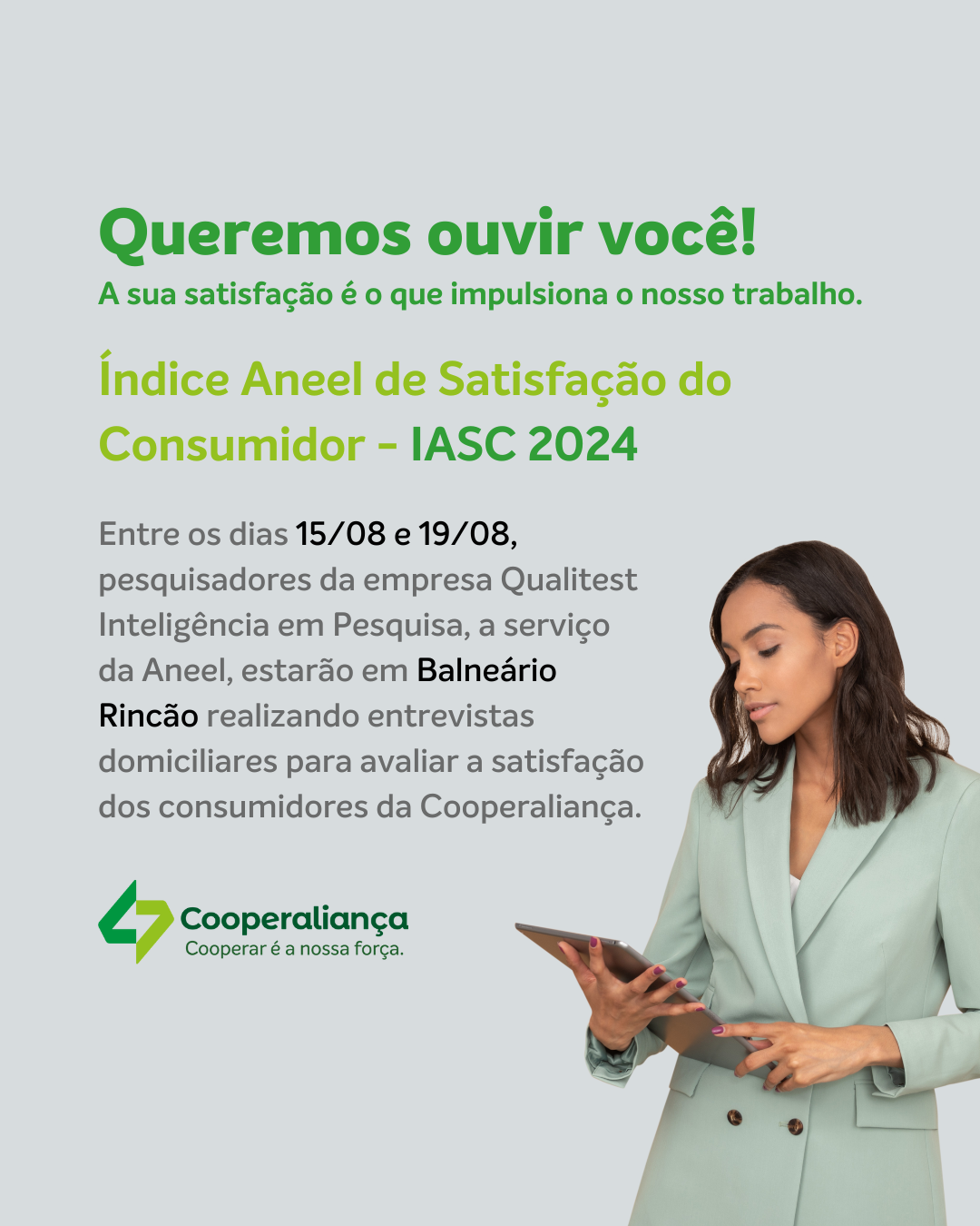 A empresa Qualitest Inteligência em Pesquisa, contratada pela Agência Nacional de Energia Elétrica (Aneel), comunicou à Cooperaliança que a avaliação do nível de satisfação dos consumidores em Içara, inicialmente prevista para começar nesta quinta-feira, 15, será adiada em razão de ajustes no cronograma.