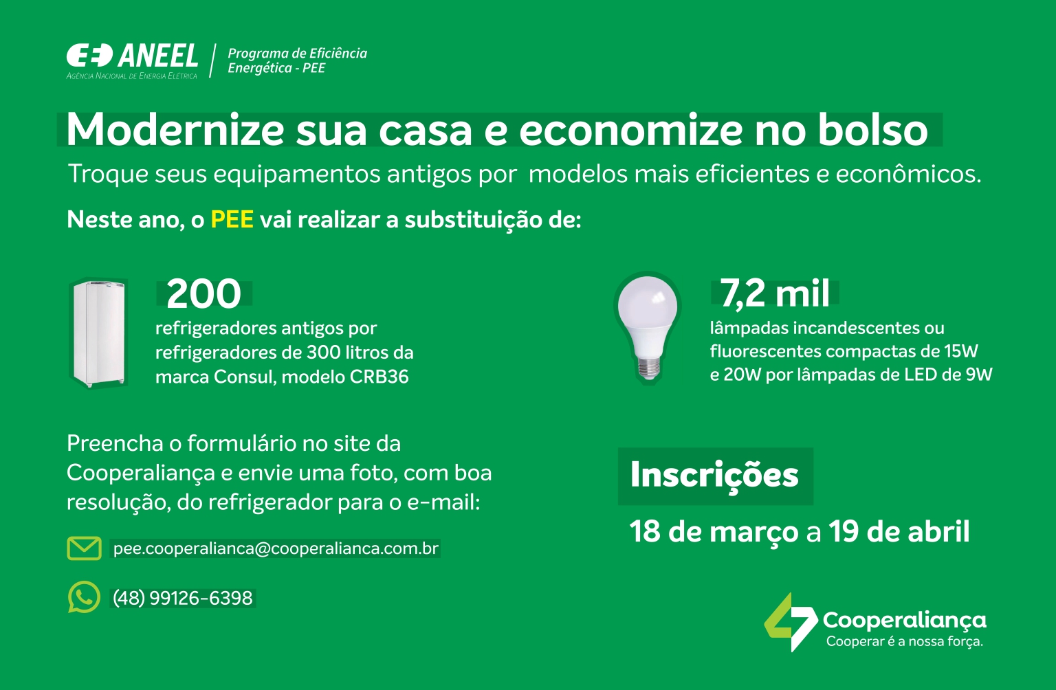 A partir desta segunda-feira, dia 18, a Cooperaliança dará início às inscrições do Programa de Eficiência Energética (PEE) 2024. Com prazo até o dia 19 de abril, a iniciativa deve substituir 200 refrigeradores de 300 litros, da marca Consul, modelo CRB36. A ação visa garantir maior economia de energia e a redução dos impactos ambientais.