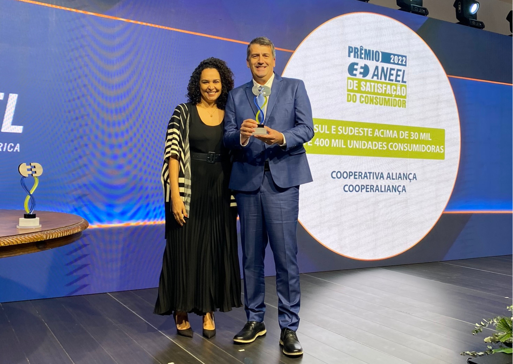 A Agência Nacional de Energia Elétrica (ANEEL) realizou na tarde dessa quinta-feira, 25, em Brasília, a cerimônia de divulgação das distribuidoras vencedoras do Prêmio Aneel de Satisfação do Consumidor 2022. A Cooperaliança estava entre as finalistas na categoria Sul e Sudeste acima de 30 mil até 400 mil unidades consumidoras e se tornou vencedora pelo segundo ano consecutivo.