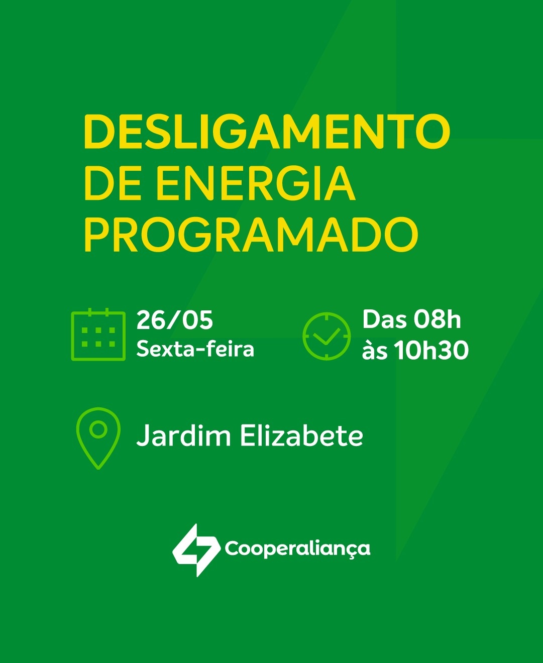 A Cooperativa Aliança comunica aos seus associados e consumidores que no dia 26 de maio (sexta-feira), haverá desligamento de energia elétrica na localidade de Jardim Elizabete.