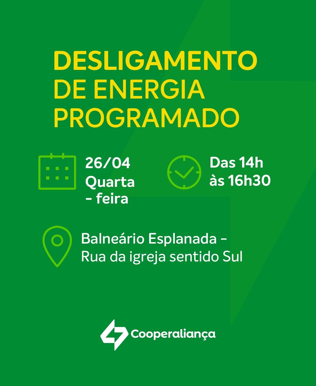 A Cooperativa Aliança comunica aos seus associados e consumidores que no dia 26 de abril (quinta-feira), haverá desligamento de energia elétrica em Balneário Esplanada, rua da igreja sentido Sul.