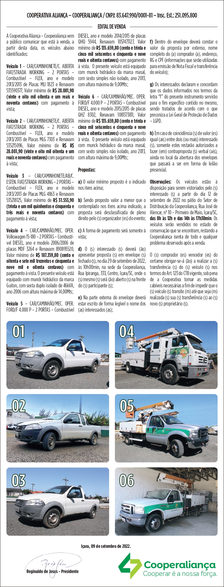 Observações: Os veículos estão à disposição para serem vistoriados pelo (s) interessado (s) a partir do dia 12 de setembro de 2022 no pátio do Setor de Distribuição da Cooperaliança, Rua José de Alencar, nº 10 – Primeiro de Maio, Içara/SC, das 8h às 12h e das 14h às 17h30min. Os veículos serão vendidos no estado de conservação que se encontram, restando a Cooperaliança isenta de todo e qualquer problema observado após a venda.